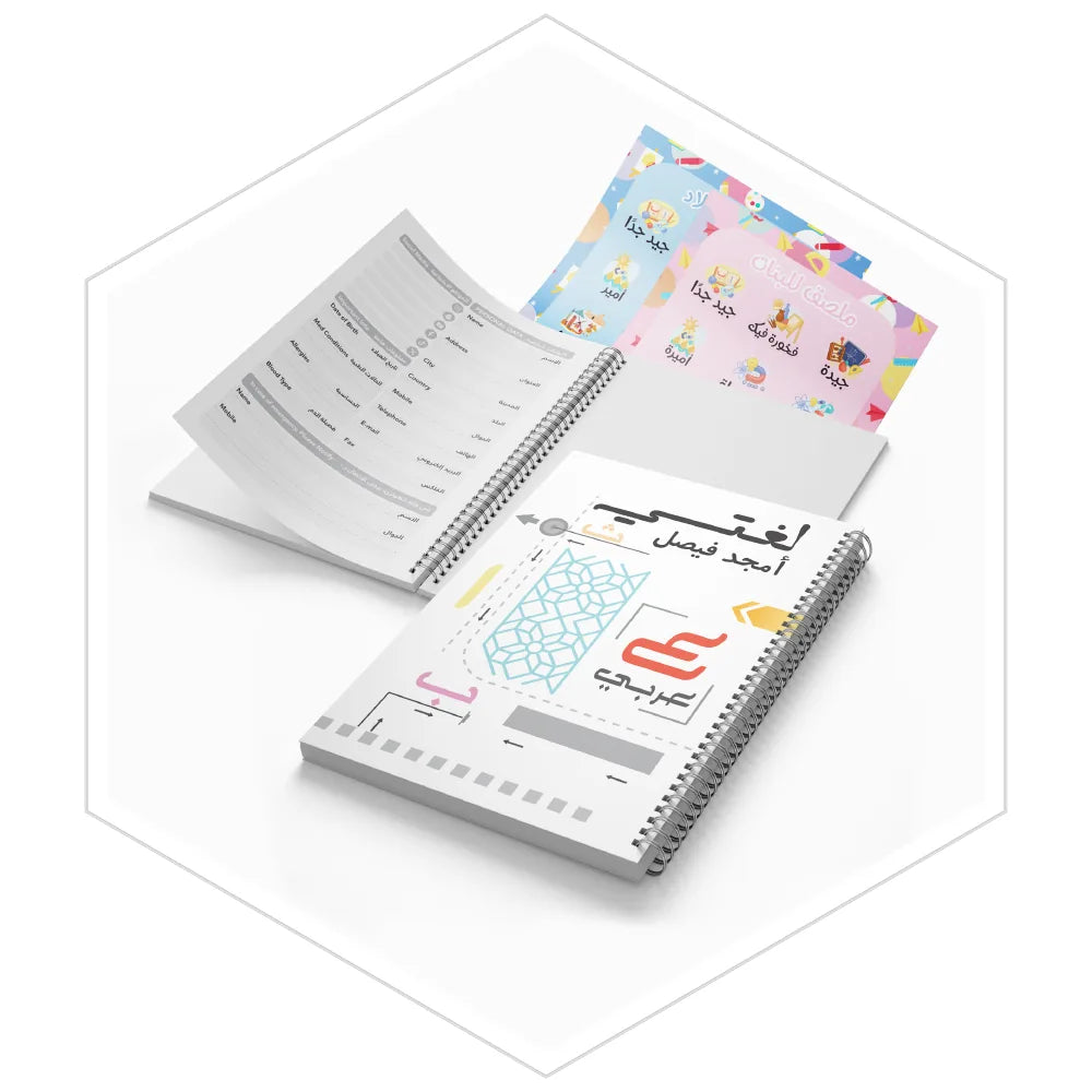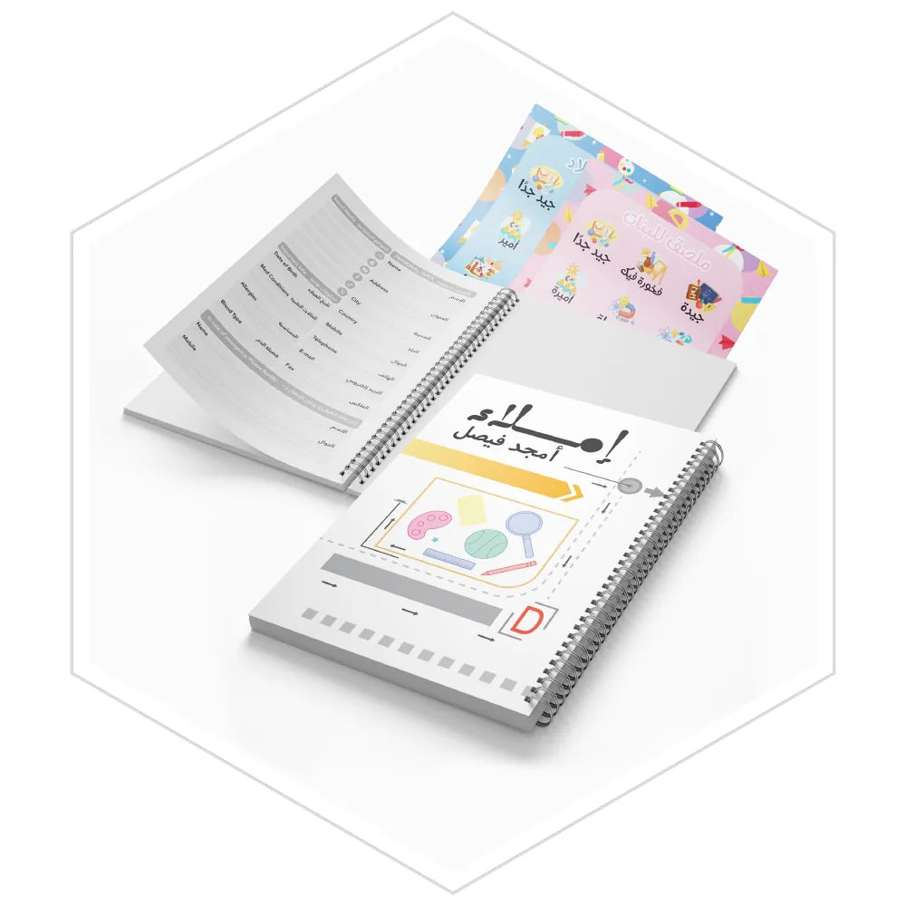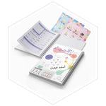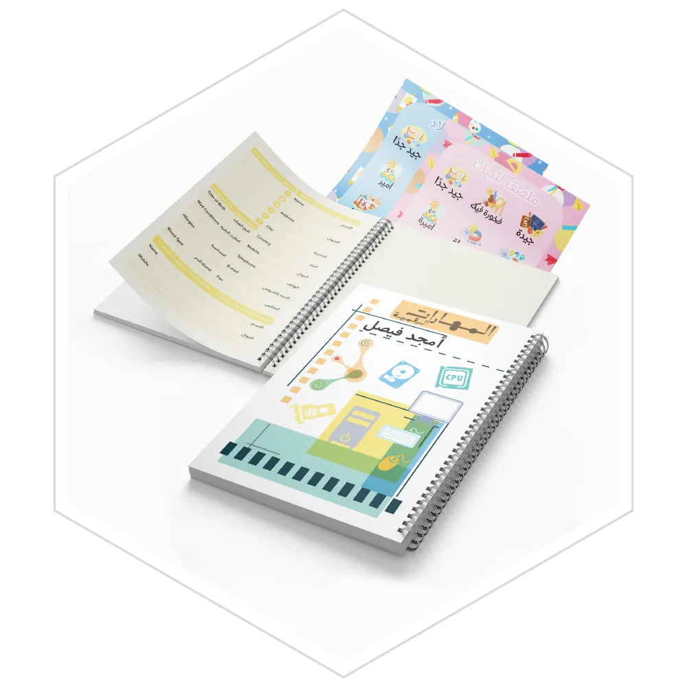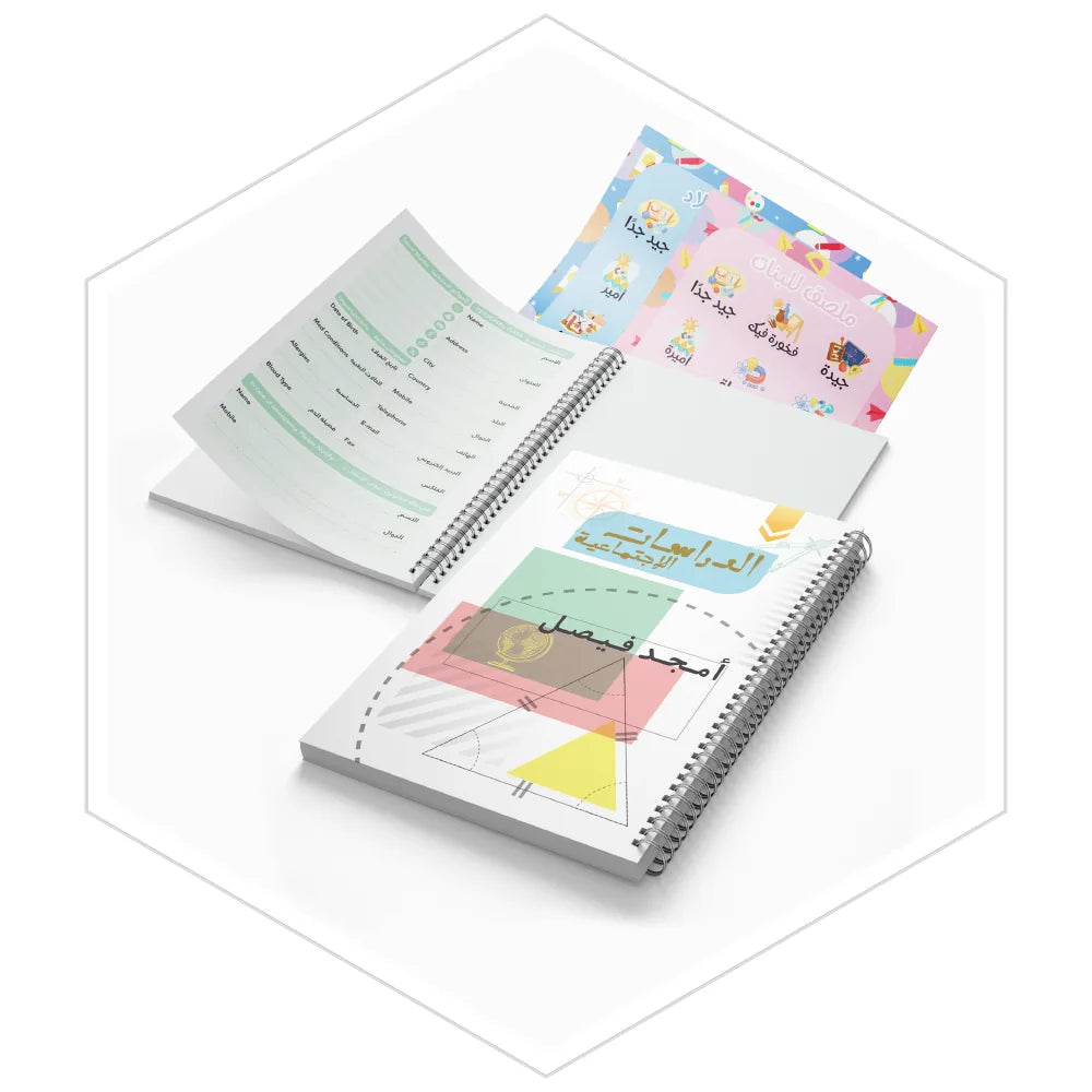 * ورقتين من الاستكر بعبارات تحفيزية وتشجيعية في نهاية الدفتر. واحدة بالوان مخصصة للأولاد والأخرى بألوان محببة للفتيات .