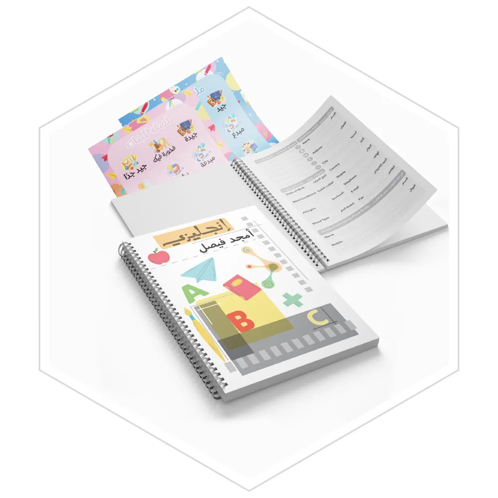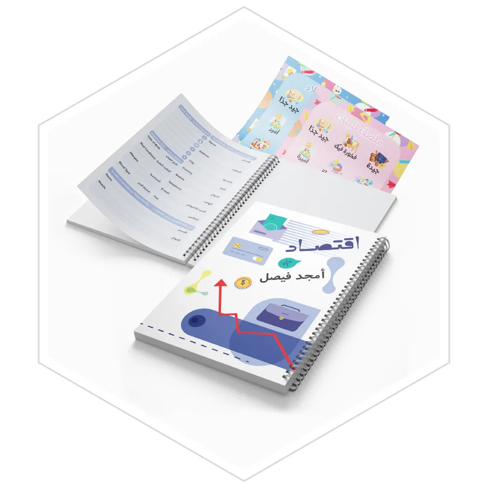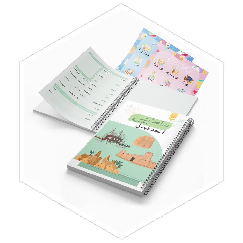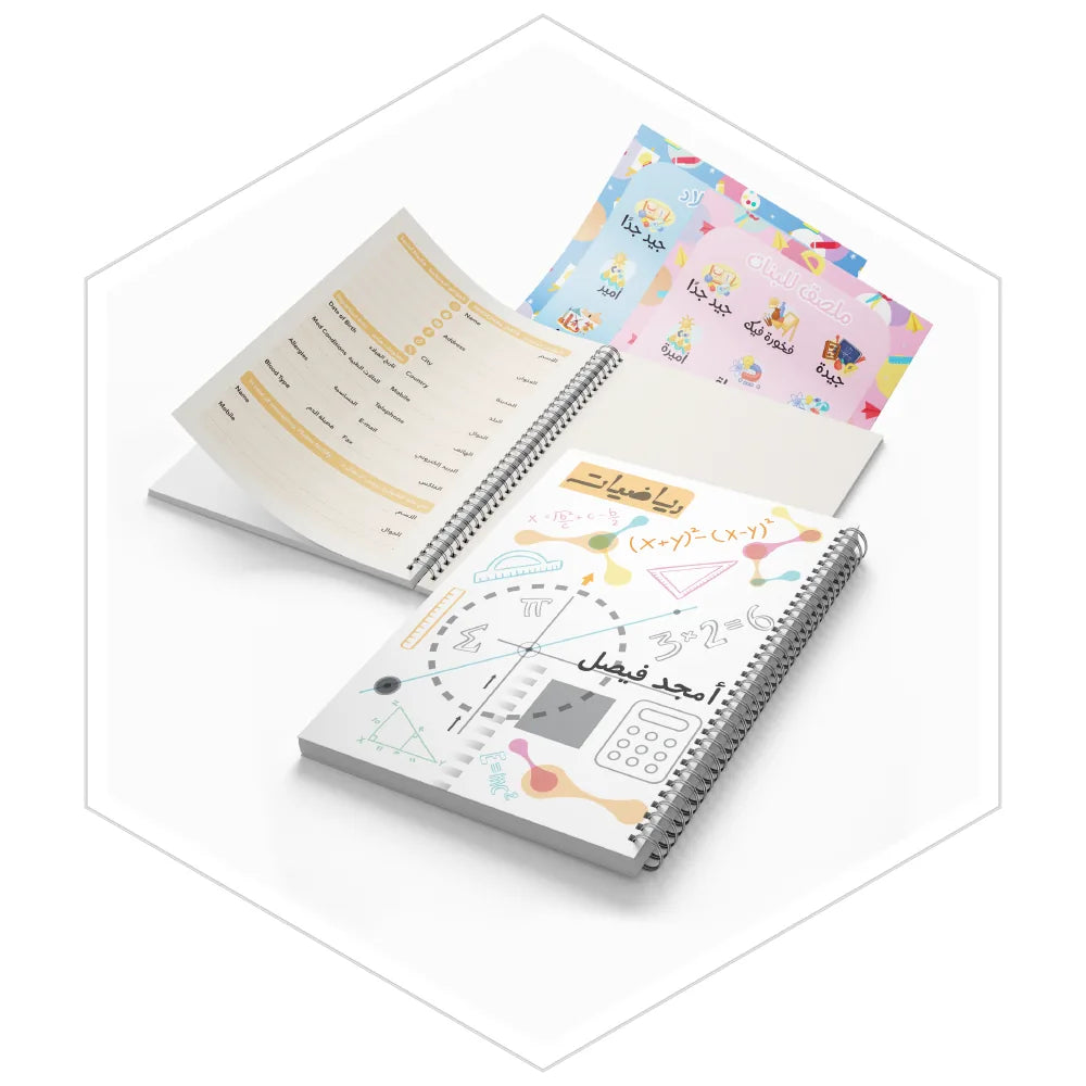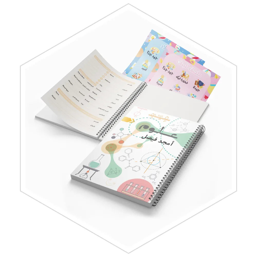 * الدفاتر مصممة بشكل مناسب للمادة الدراسية بألوان زاهية وصور لطيفة تسهل على صاحب الدفتر التواصل مع المادة وتحفز الربط الذهني.
