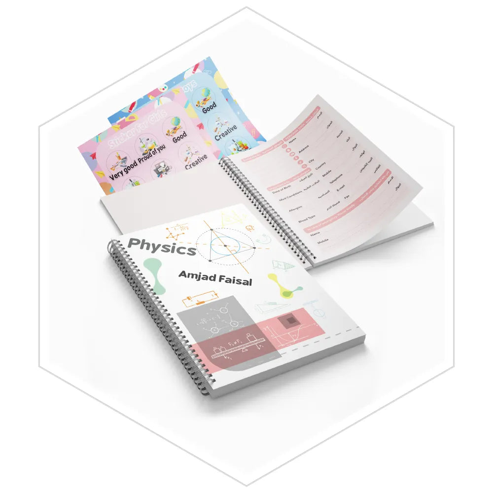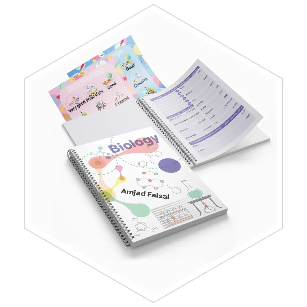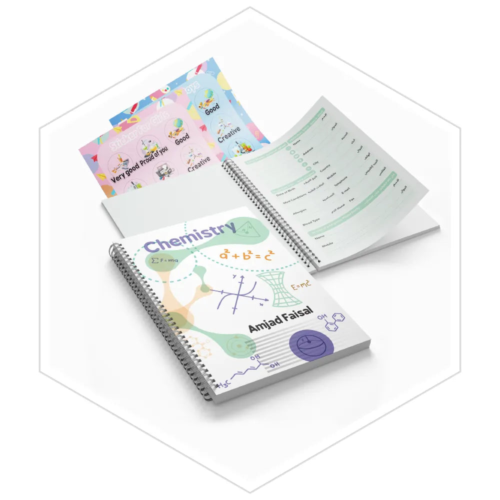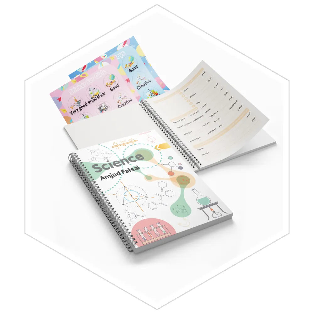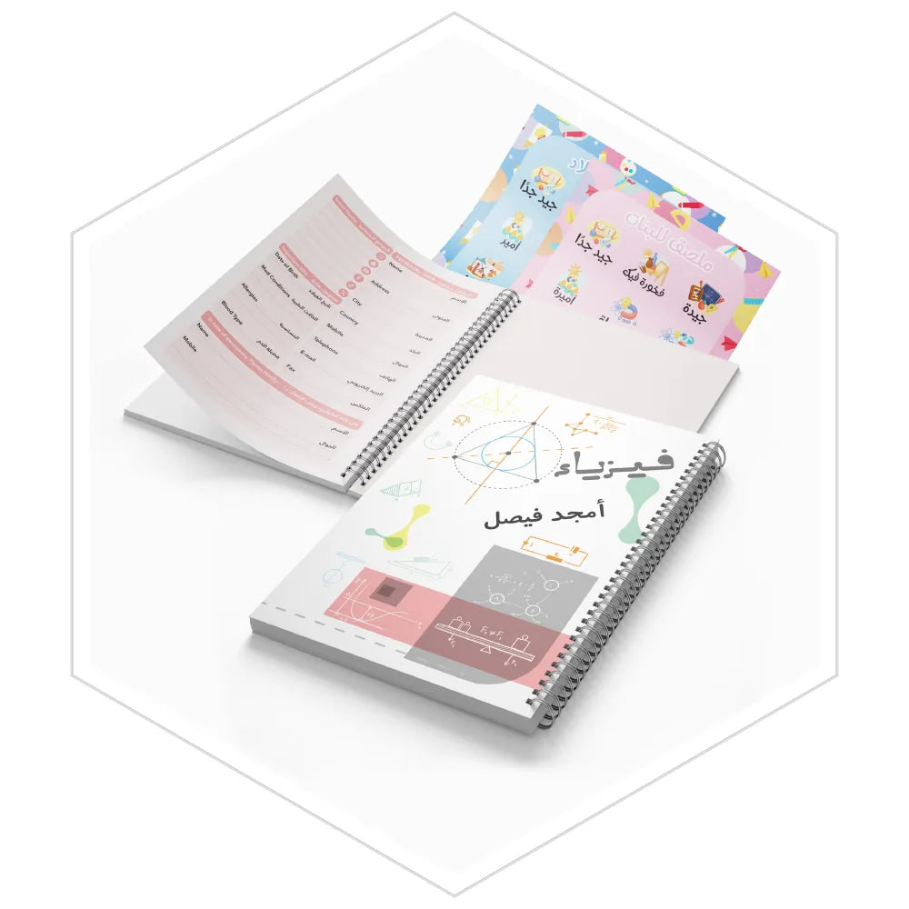 * الدفاتر مصممة بشكل مناسب للمادة الدراسية بألوان زاهية وصور لطيفة تسهل على صاحب الدفتر التواصل مع المادة وتحفز الربط الذهني.