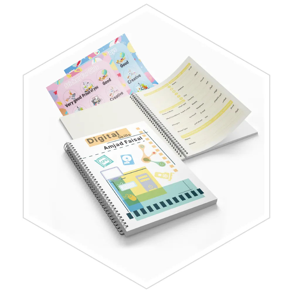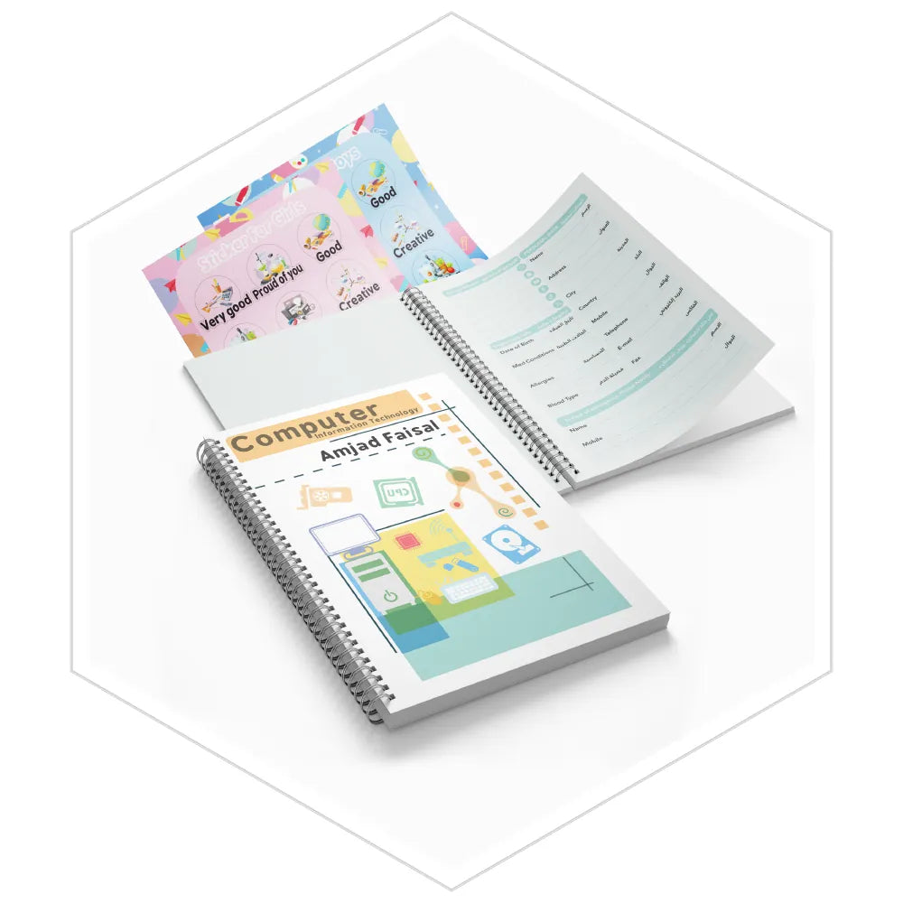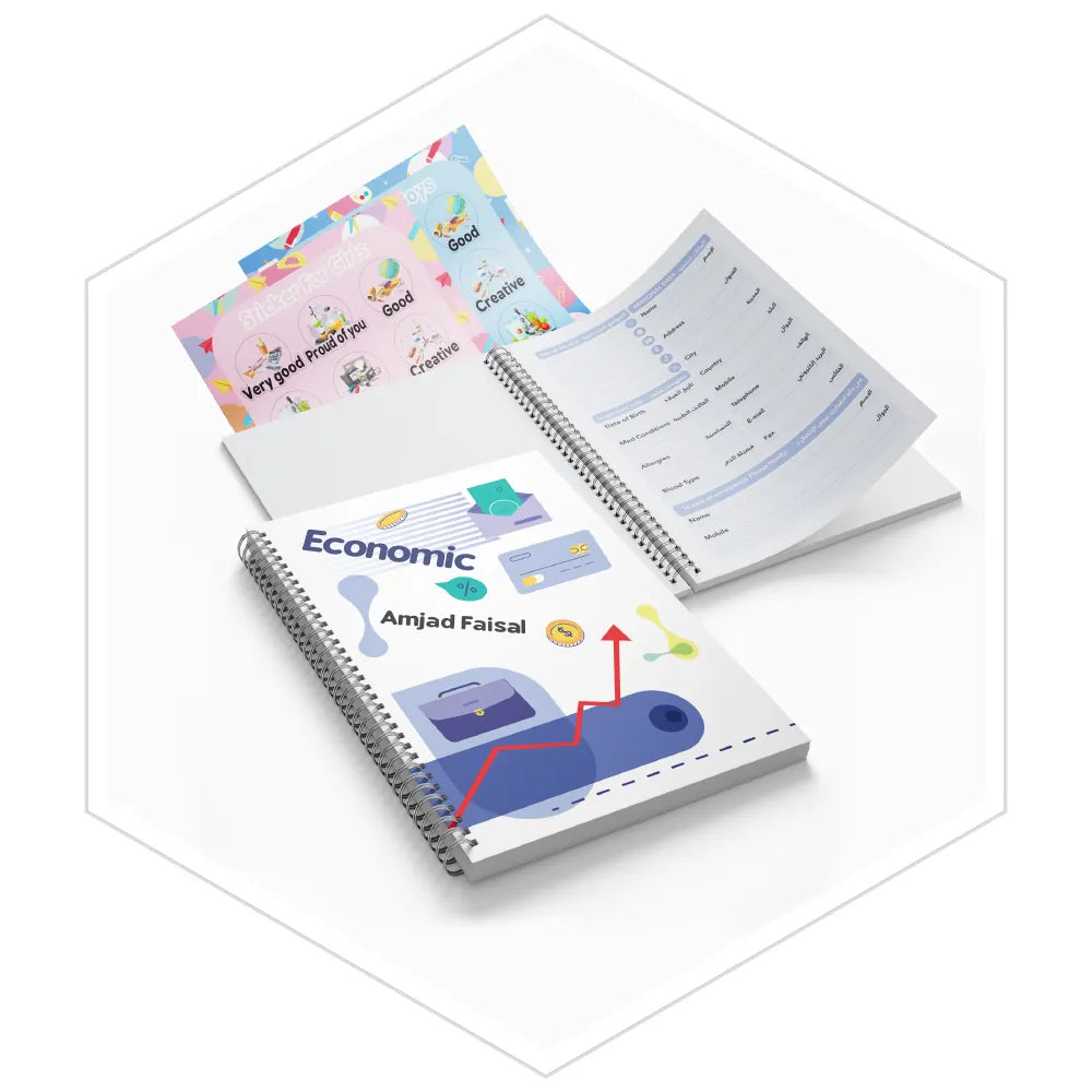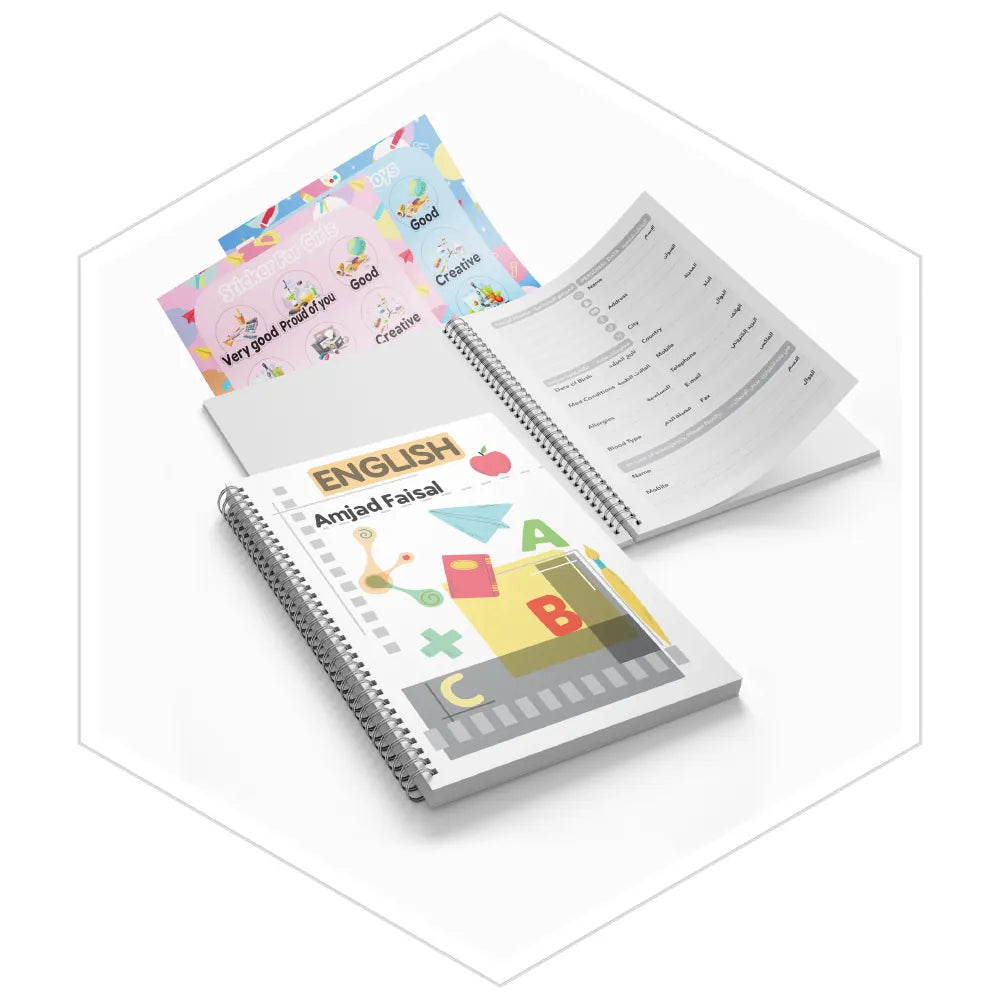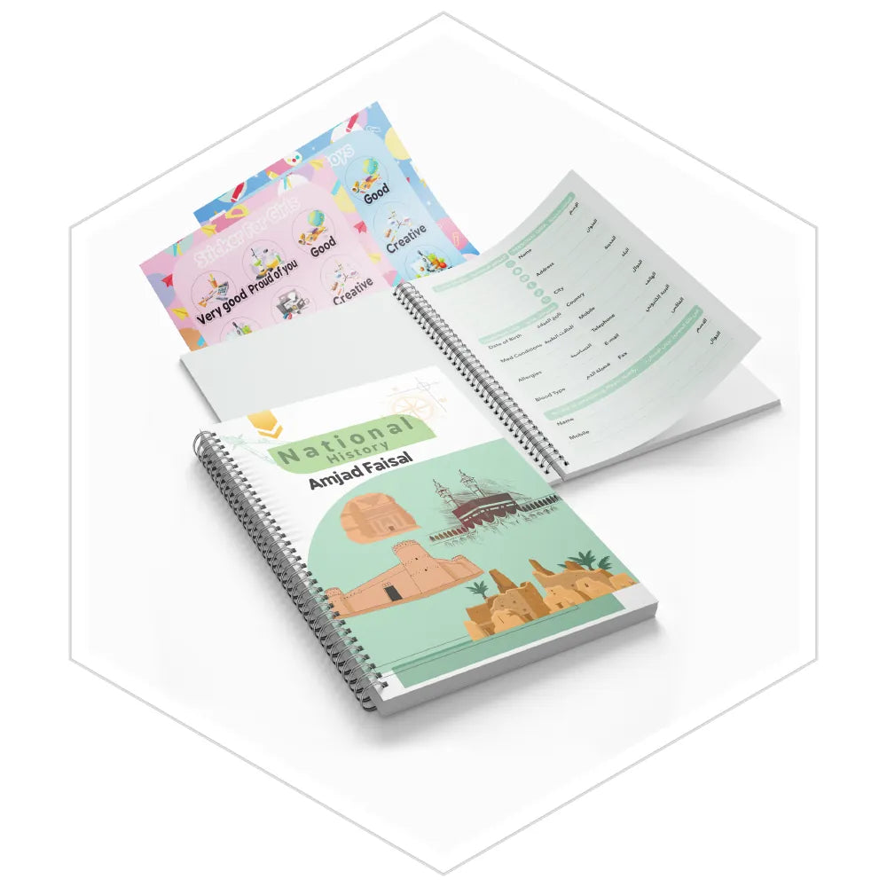 * الدفاتر مصممة بشكل مناسب للمادة الدراسية بألوان زاهية وصور لطيفة تسهل على صاحب الدفتر التواصل مع المادة وتحفز الربط الذهني.