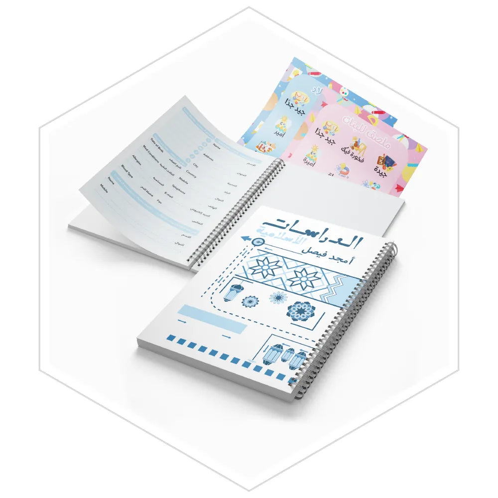 * الورق الداخلي أبيض وزن 80 جرام مسطر بأسطر عربية (أو حسب الخيارات) والكراسة 20 ورقة 180 جرام .
